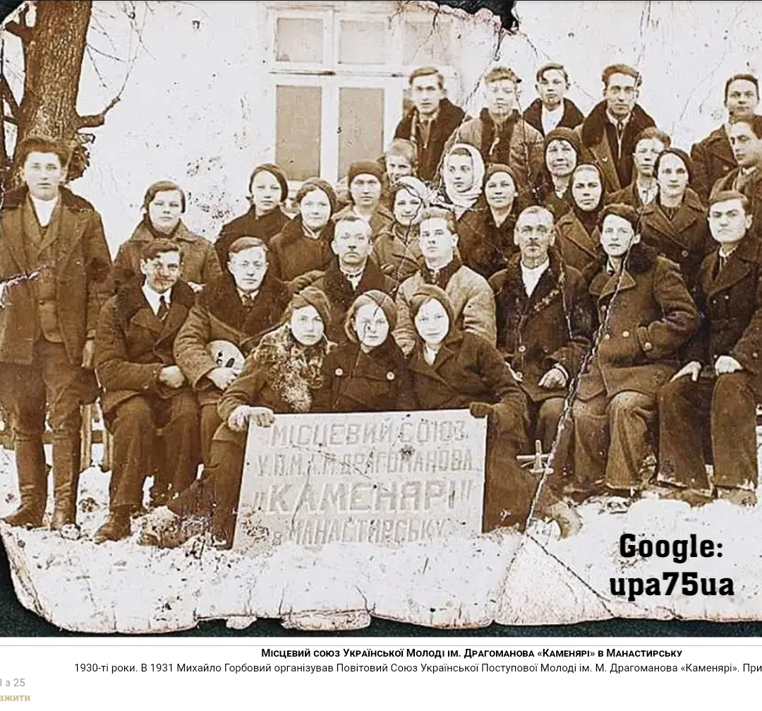 Місцевий союз Української Молоді ім. Драгоманова «Каменярі» в Манастирську 1930-ті роки. В 1931 Михайло Горбовий організував Повітовий Союз Української Поступової Молоді ім. М. Драгоманова «Каменярі».
